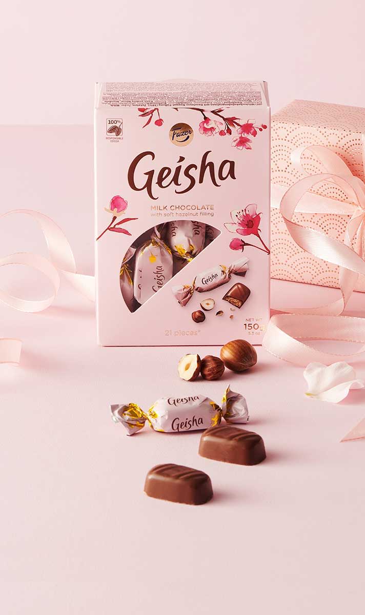それ以来、様々なGeishaの製品が作られてきました。今ではFazerの世界的ブランドの一つとなり、その美味しさで世界中の多くの人に愛されています。