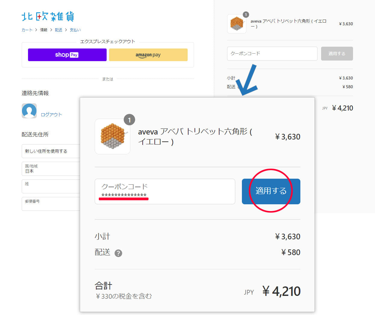 下の小計に割引額が表示されたら、クーポン適用が完了です!